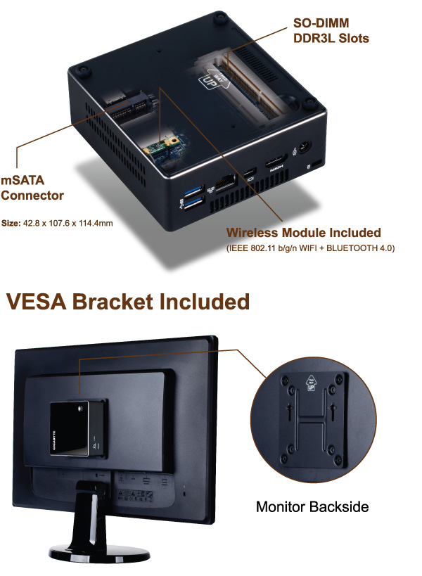 Bundled with a VESA bracket, the BRIX can easily be mounted behind a monitor or HDTV making it discreetly hidden from view. This makes it simple and effective way to turn any VESA-compliant display or TV into a full-featured PC or digital signage unit.
